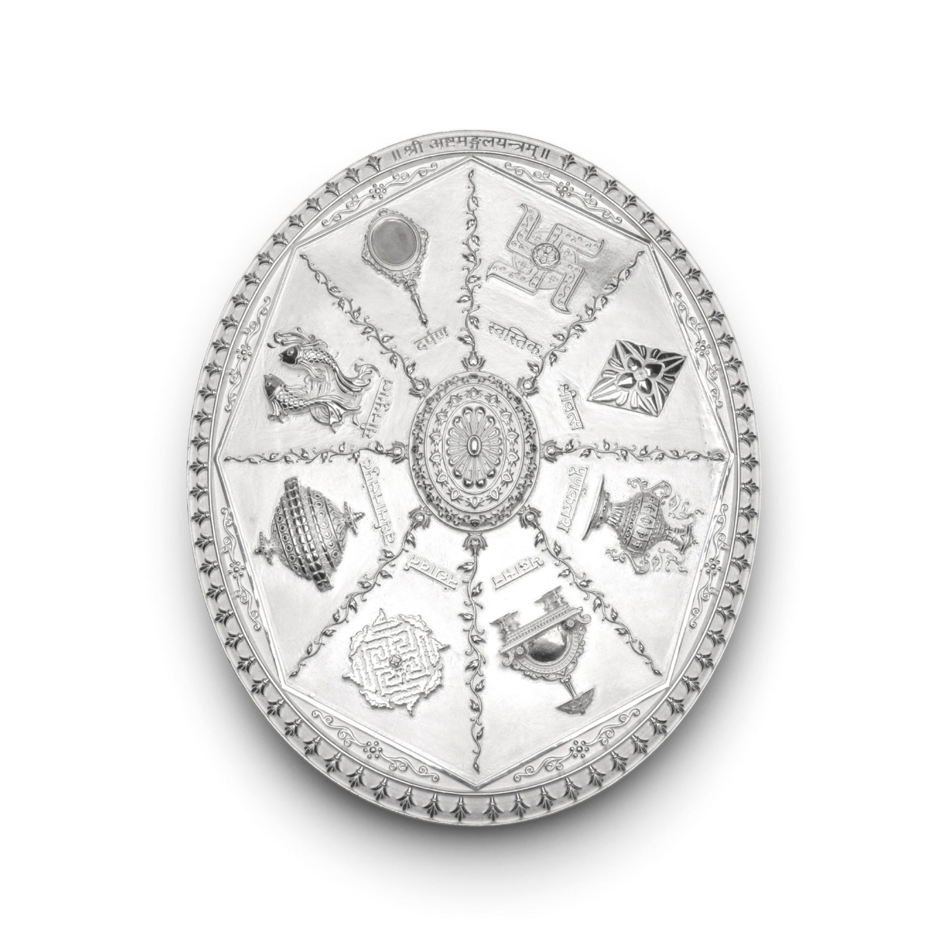 Invite prosperity, harmony, and spiritual blessings into your rituals with this exquisitely designed Ashtamangal plate, a revered symbol set in Jain, Hindu, and Buddhist traditions. The Ashtamangal comprises eight auspicious symbols, each representing unique facets of spiritual prosperity, purity, and good fortune.