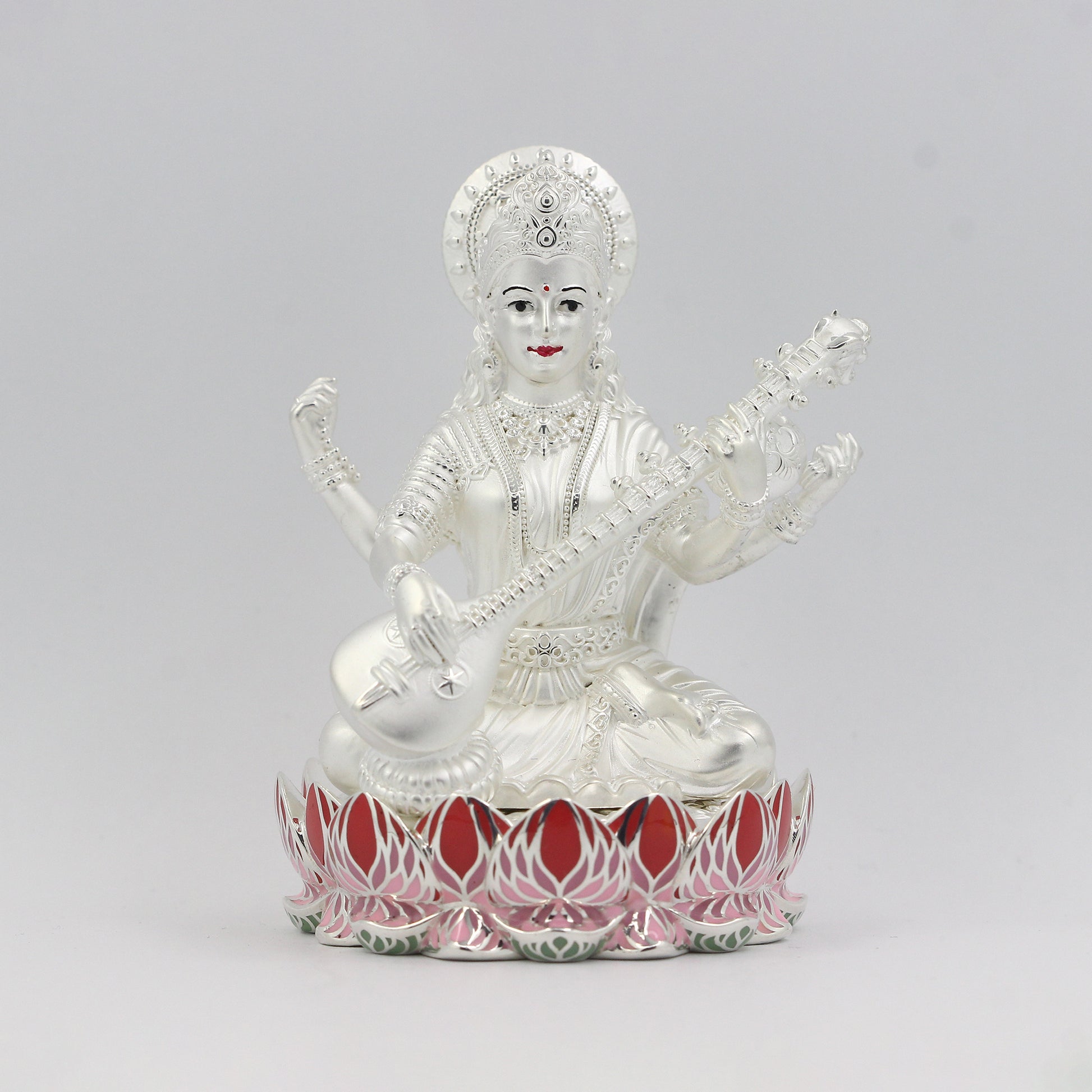 Silver Premium Matte Lotus Base Saraswati with Enamel