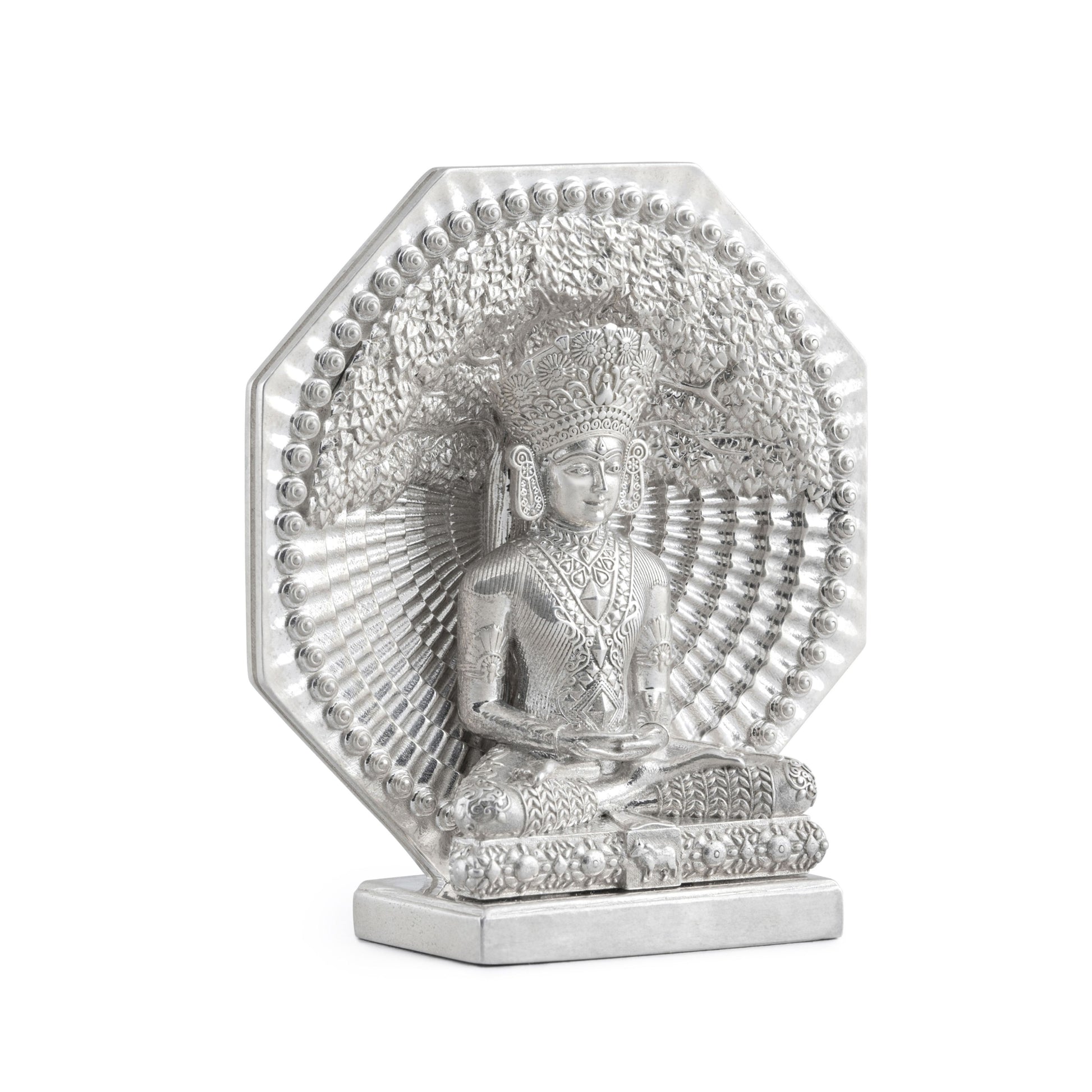 The intricate radiating patterns symbolize the spreading of spiritual knowledge, while the octagonal frame and ornate borders lend the coin a majestic, sacred aura. Each element of the design pays homage to Mahavir Swami’s message of non-violence, truth, and liberation, serving as a powerful reminder of his enduring influence and compassion.