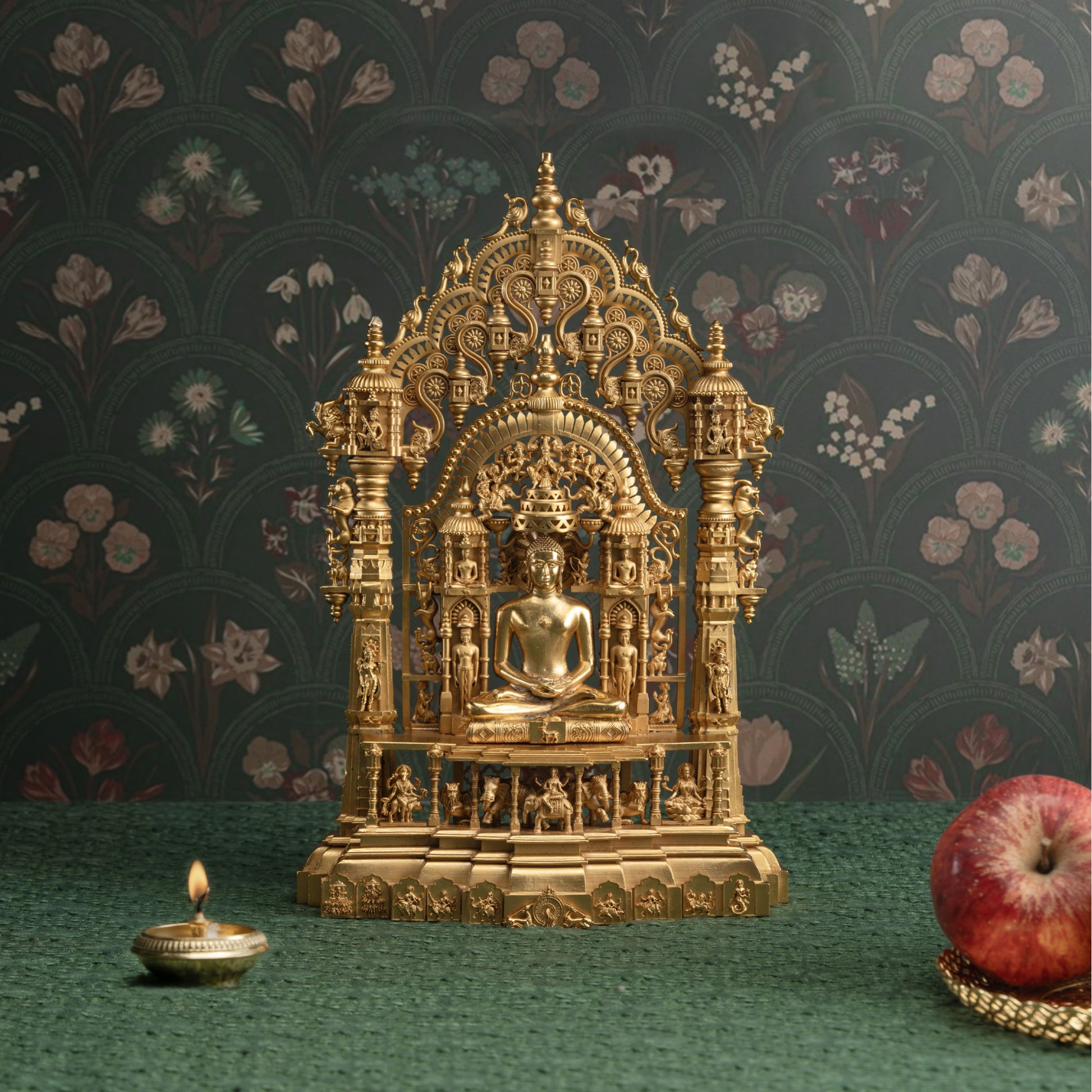Elevate your surroundings with this magnificently crafted Jain Tirthankar idol, an embodiment of spiritual purity, tranquility, and profound devotion. Depicting a revered Tirthankar seated in serene meditation within an ornate, exquisitely detailed shrine, this statue radiates an aura of peace and enlightenment, making it a captivating centerpiece for contemplation and worship.
